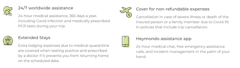 L'assicurazione di viaggio HeyMondo offre una suite di assistenza completa, fornendo supporto 24 ore su 24 per qualsiasi problema legato ai viaggi. Aggiungendo una dimensione distintiva, Heymondo offre una caratteristica unica sotto forma di una chat medica. Questa innovativa disposizione consente di interagire con esperti medici, permettendoti di cercare consulenza su qualsiasi questione legata alla salute che potrebbe sorgere durante i tuoi viaggi.